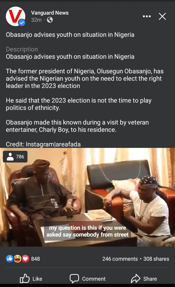 Obasanjo replied him saying that he is the father figure of the frustrated Nigerian youths. Watch the video here at 0:22 seconds. Charly Boy asked Obasanjo what his advise will be to a Nigerian youth that have tried everything possible but was unable to get job, and have no hope, coupled with a toxic environment, what would he say to that youth to give him/her some hope.