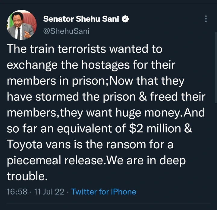 The former Senator of Kaduna Central, Senator Shehu Sani has taken to his official Twitter handle to bemoan the outrageous ransom demanded by the terrorists that attacked the Abuja-Kaduna railway on March 28, 2022. Recall that during that attack, about eight passengers died at the scene while scores of others were been kidnapped. To negotiate their release with the Federal Government, the terrorists had demanded that the government release 12 of their commanders in prison.