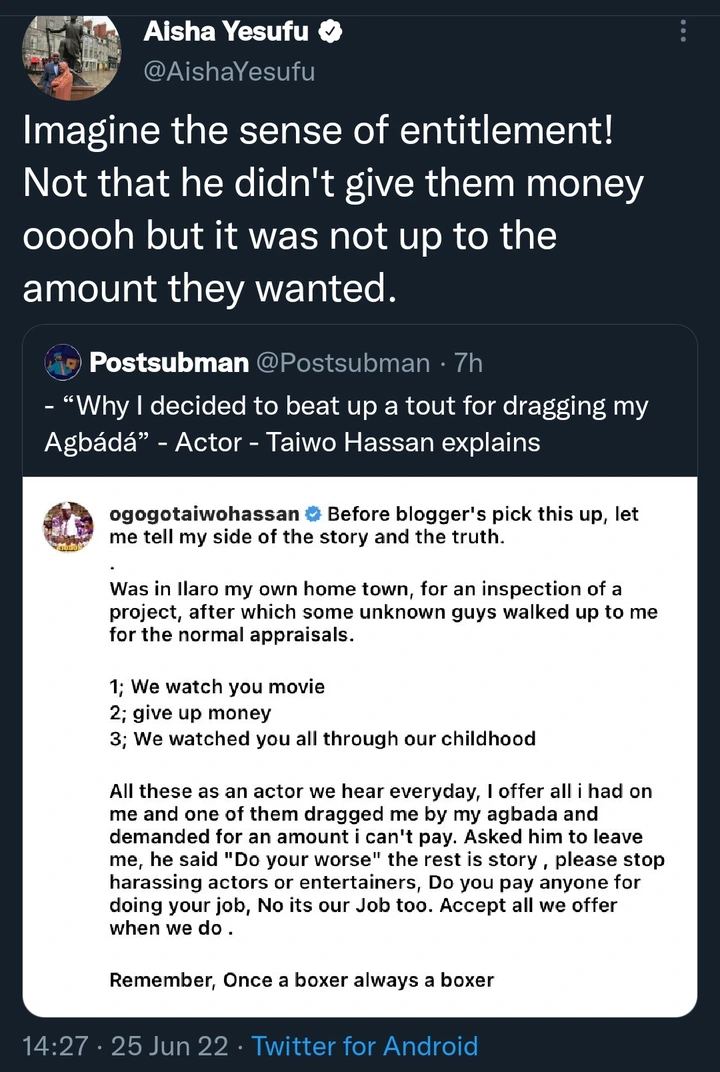 However, while reacting to this, Aisha Yesufu condemned what the supporter did. According to her, she said, “Imagine the sense of entitlement! Not that he didn’t give them money ooooh but it was not up to the amount they wanted.”