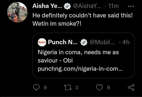 Popular human right activist and political analyst, Aisha Yesufu has taken to his official twitter page to react to a latest news headline distributed by punchnewspapers in which Peter Obi allegedly said Nigeria is in coma and that Nigeria needs him as saviour.