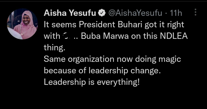 “It seems President Buhari got it right with Buba Marwa on this NDLEA thing. The same organization now doing magic because of leadership change. Leadership is everything” she wrote.