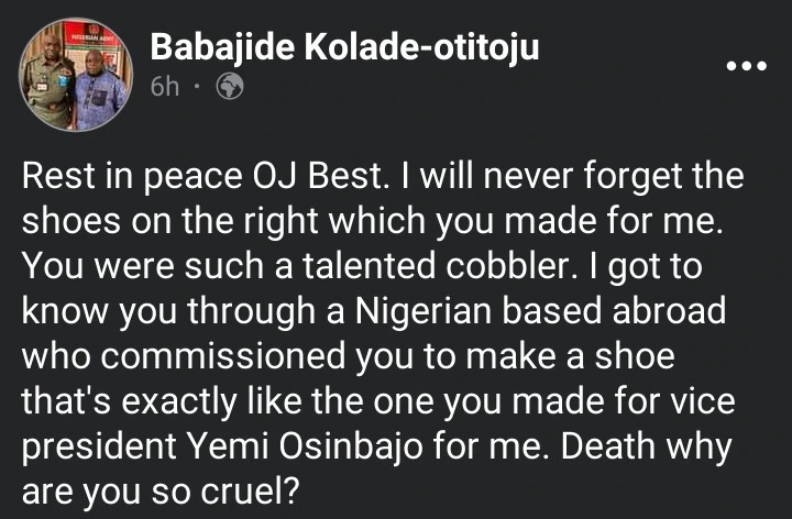 Babajide Kolade-Otitoju reacts to death of OJ Best who made shoes for him and VP Yemi Osinbajo