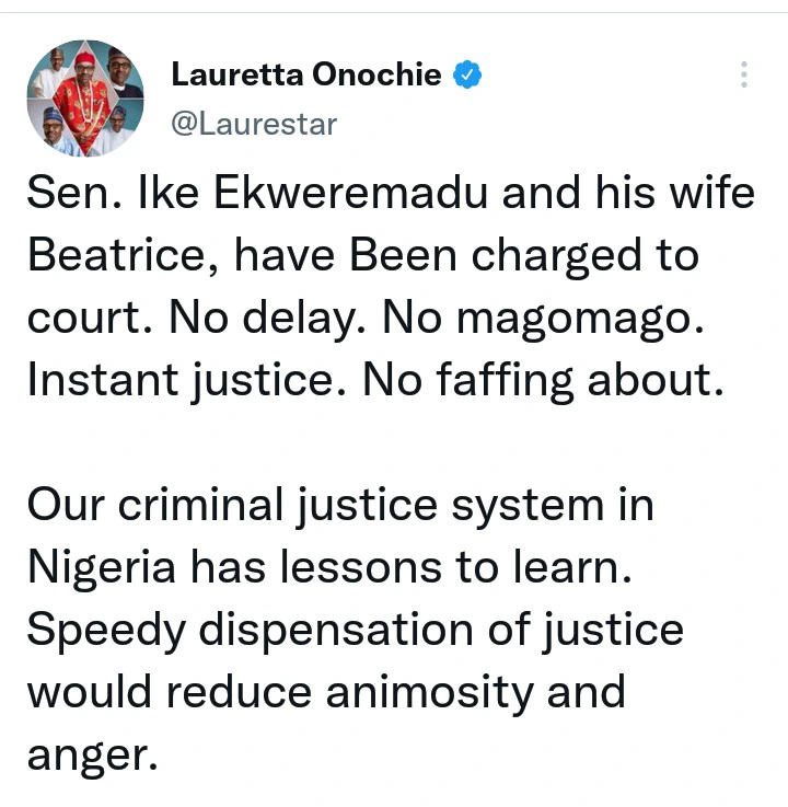 “Sen. Ike Ekweremadu and his wife Beatrice, have Been charged to court. No delay. No magomago. Instant justice. No faffing about.