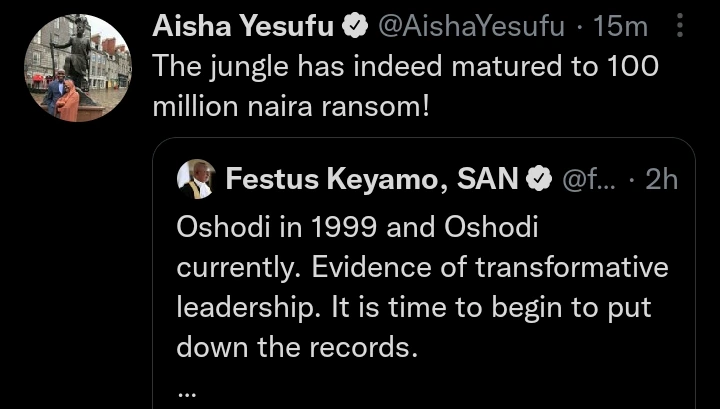 Reacting to the tweet, Aisha Yesufu, who is known for her outspokenness stated that the Jungle has Indeed matured to #100 million ransom.