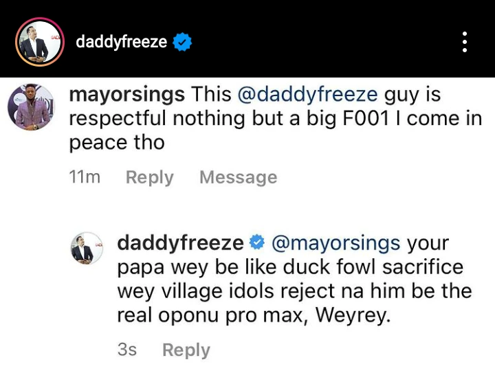 In a recent development, an Instagram user identified by his handle as mayorsings took to the comment section to pen a very derogatory statement about Daddy Freeze while claiming that he comes in peace and doesn’t intend to trigger uproars.