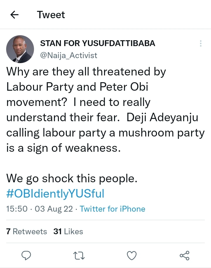 Speaking through his official Twitter handle, he said, “Why are they all threatened by the Labour Party and the Peter Obi movement? I need to really understand their fear.  Deji Adeyanju calling the Labour Party a “Mushroom Party” is a sign of weakness. “