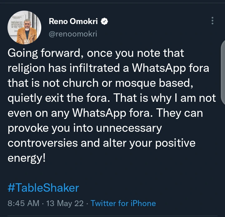 While giving out his advice, Reno Omokri said if a group or forum that is not religiously related started to have discussion and content that is related to religious activities, he said it is better to exit such platform. Reno Omokri further reveals that he did not belong to any WhatsApp group because of arguments that can lead to unnecessary misunderstanding.