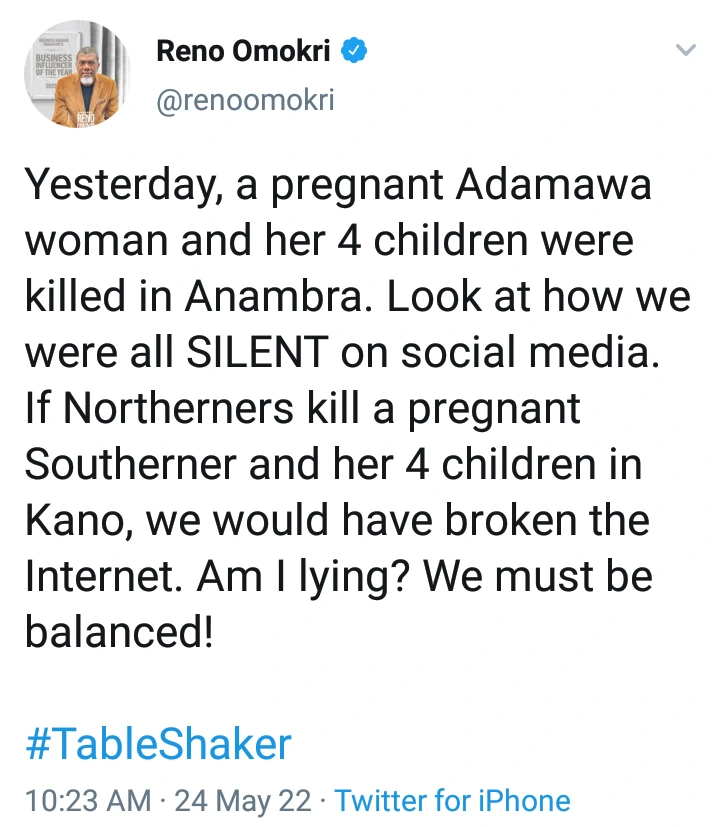 He condemned the silence of the people on the issue on social media. He claimed that if Northerners had killed a pregnant Southerner and her four kids in Kano State, they would have broken the internet.