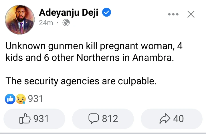 While reacting to the gruesome killing, Deji Adeyanju took to his Facebook handle to condemn the act. In his Facebook post, he wrote that unknown gunmen killed a pregnant woman, her four children, and six other Northerners in Anambra State. He ended his post by saying that the security agencies are culpable.