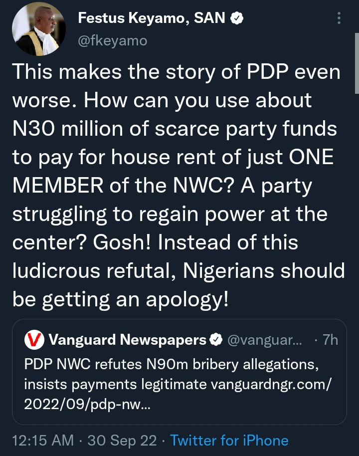 According to a post on his official Twitter timeline, “This makes the story of PDP even worse. How can you use about N30 million of scarce party funds to pay for the house rent of just one member of the NWC? A party struggling to regain power at the center?”