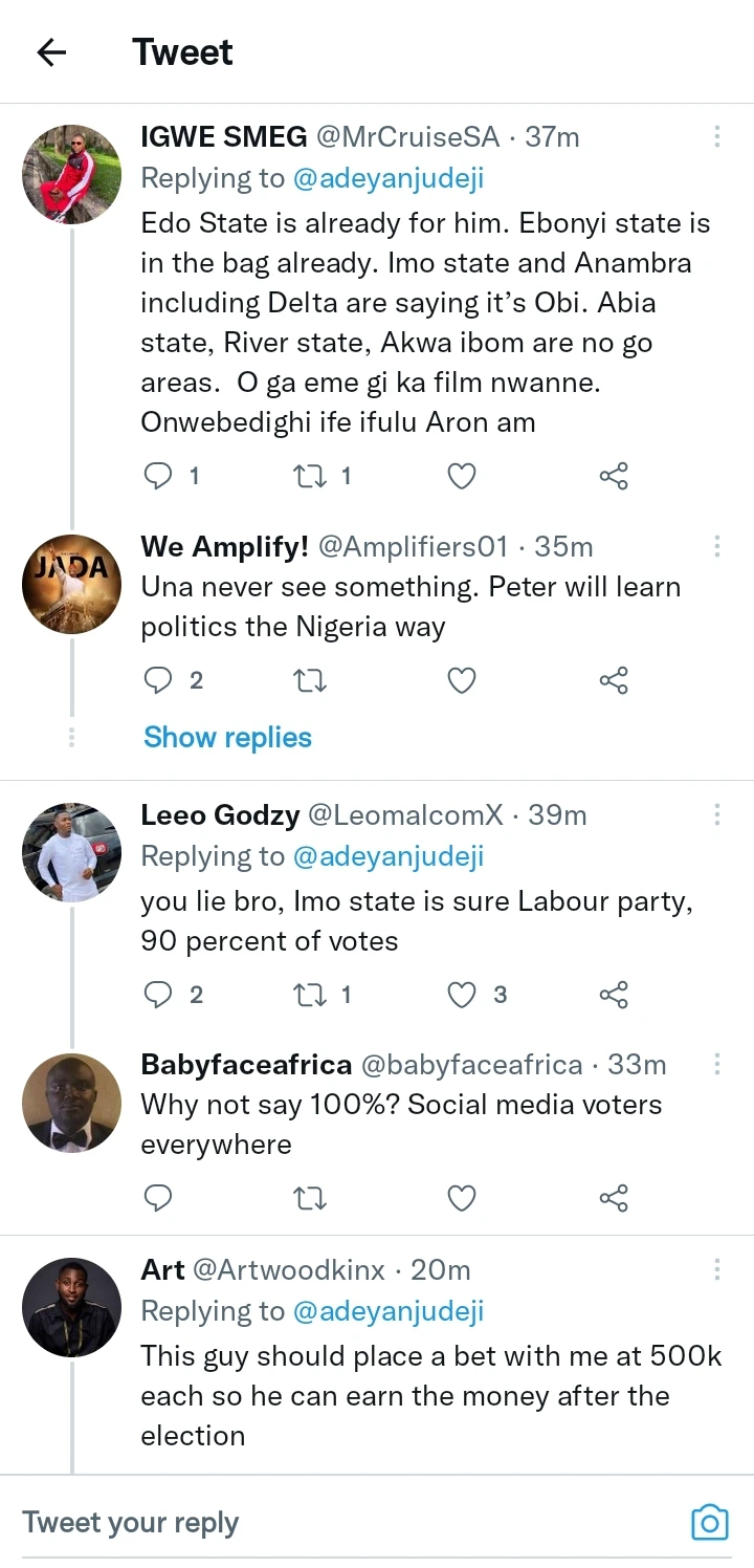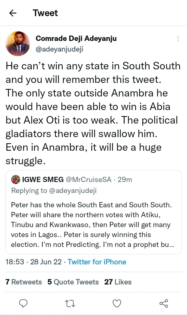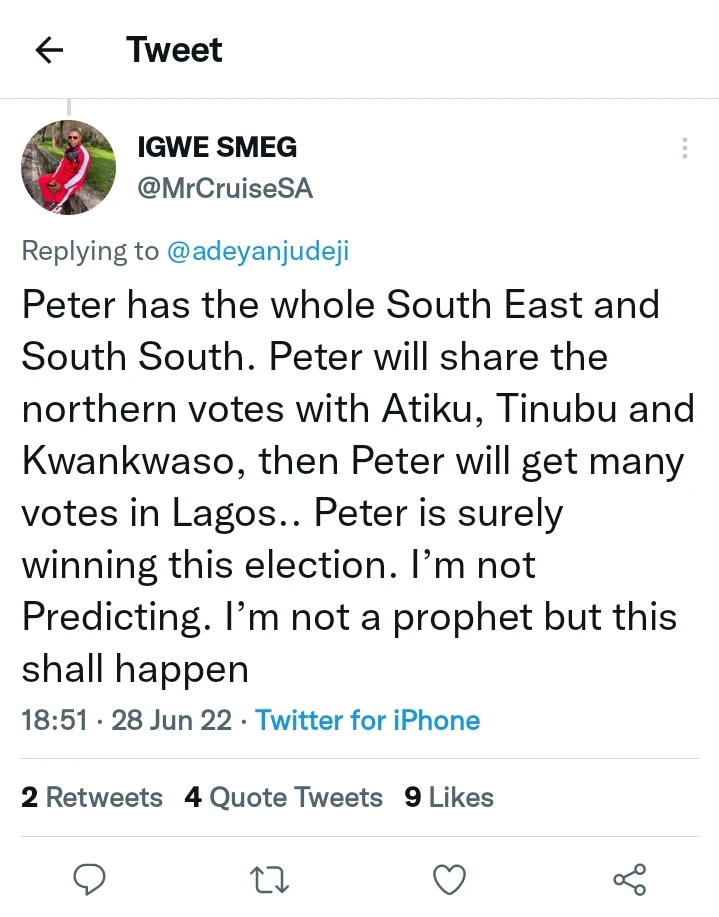 According to what the supporter tweeted, “Peter has the whole South East and South South.” Peter will share the northern votes with Atiku, Tinubu, and Kwankwaso, then Peter will get many votes in Lagos. Peter is surely winning this election. I’m not predicting. I’m not a prophet, but this shall happen. “Deji, who couldn’t help but share his opinion, noted that Peter Obi can’t win any state in the South South. He noted that people would remember that he said this.
