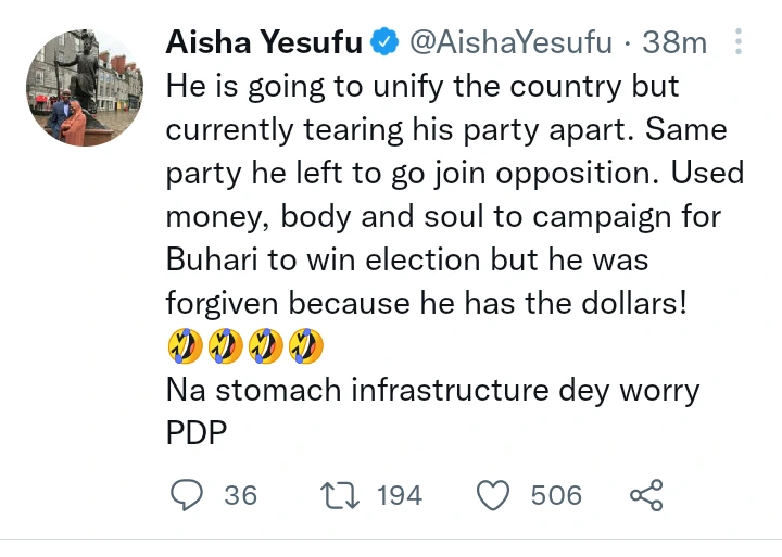 Amid the rumours of division in the camp of the Peoples Democratic Party, Aisha Yesufu, a renowned activist in a post released by her few hours ago, took a quick swipe at the presidential flagbearer of the Peoples Democratic Party for the forthcoming 2023 presidential election.