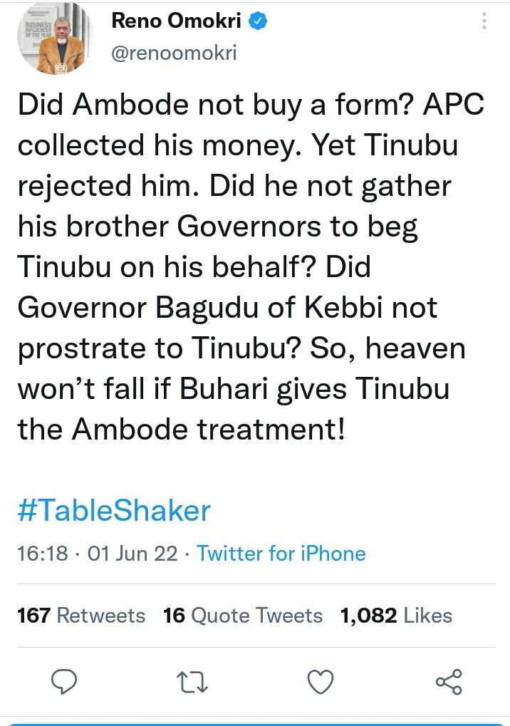 Taking to his Twitter handle a few hours ago, former presidential aide, Reno Omokri, slammed Tinubu’s supporters for daring to demand that Buhari should not have a say on who succeeds him.