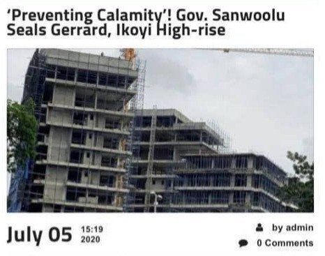 In July 2020, it was reported that Sanwo-Olu had sealed the Gerard, Ikoyi high-rise.