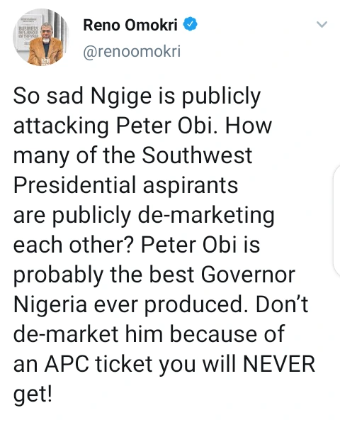 Reno Omokri further asked Chris Ngige how many presidential candidates in the Southwest region of Nigeria are publicly advertising each other, adding that Peter Obi is probably the best governor the country has ever produced.