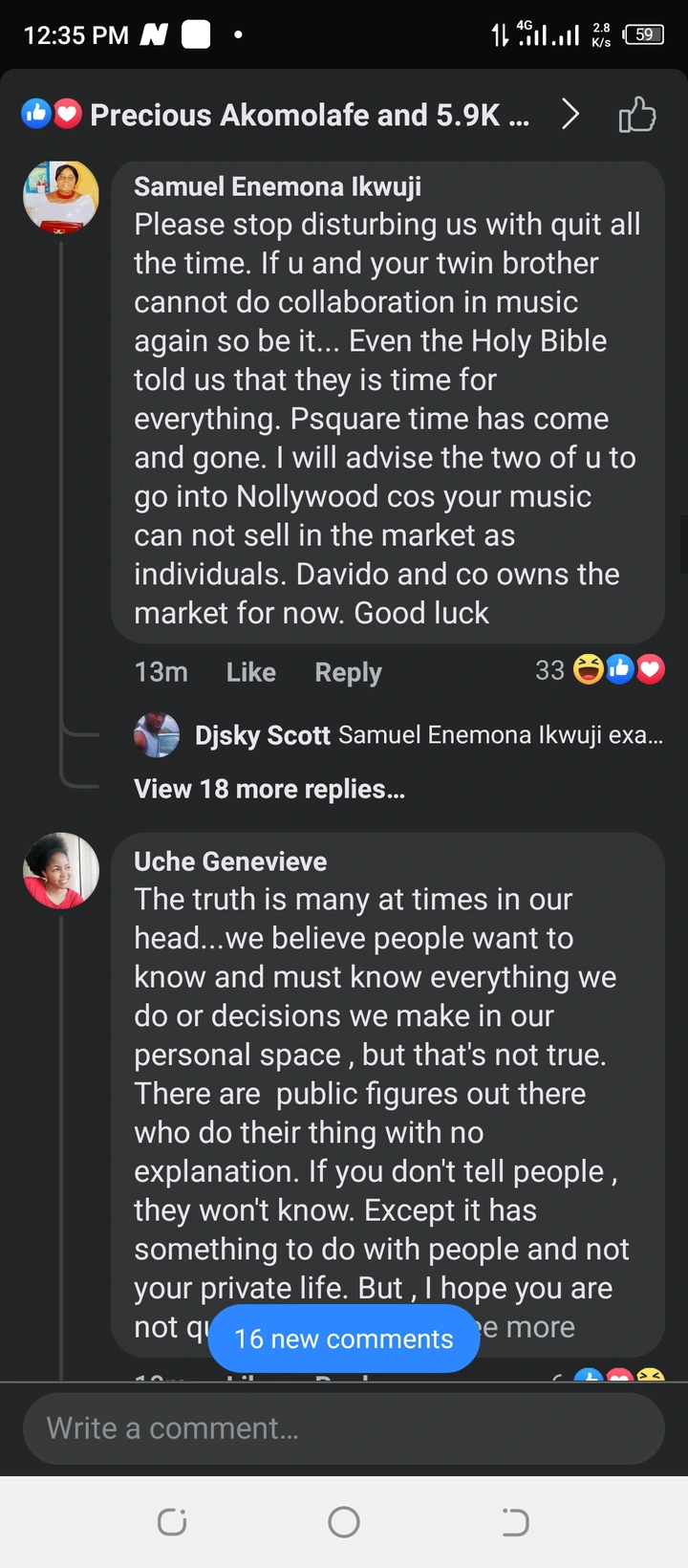 2. “Please stop disturbing us with quit all the time. If u and your twin brother cannot do collaboration in music again so be it… Even the Holy Bible told us that they is time for everything. Psquare time has come and gone. I will advise the two of you to go into Nollywood cos your music can not sell in the market as individuals. Davido and co owns the market for now. Good luck”