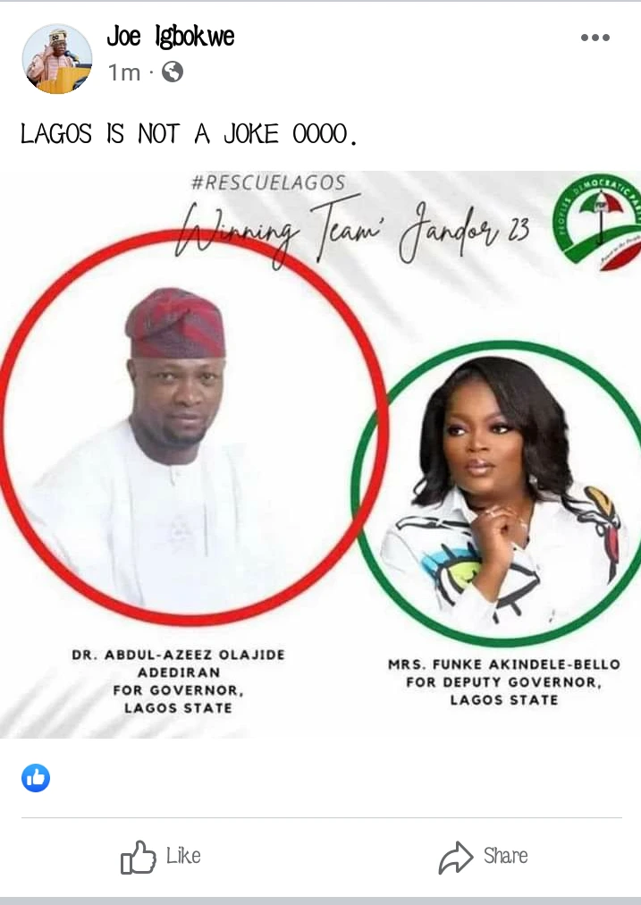Amid reports that popular Nollywood actress, Funke Akindele Bello has clinched the Peoples Democratic Party (PDP) Lagos State Deputy Governorship ticket, an All Progressives Congress (APC) chieftain, Joe Igbokwe, has come out to air his opinion on the development.