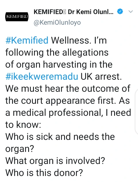 Kemi Olunloyo finally stated that as a medical professional that she is, she needs to know who is sick and needs the organ, what organ is involved and who is the donor of such organ.