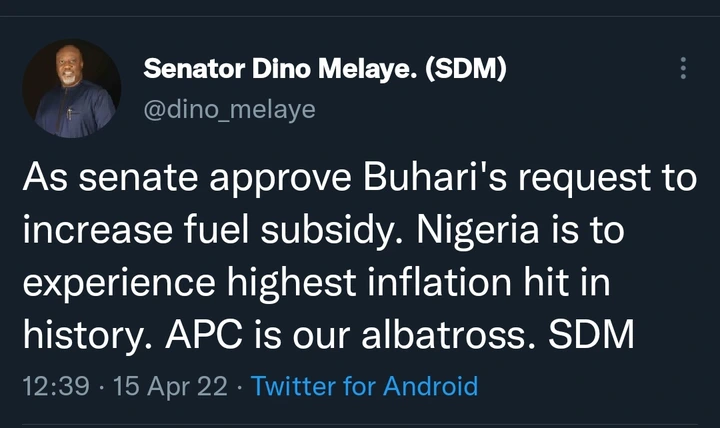 Also, former Senator Dino Melaye decried the grant of the request. According to him, he said, “As senate approves Buhari’s request to increase fuel subsidy, Nigeria is to experience highest inflation hit in history. APC is our albatross. SDM”