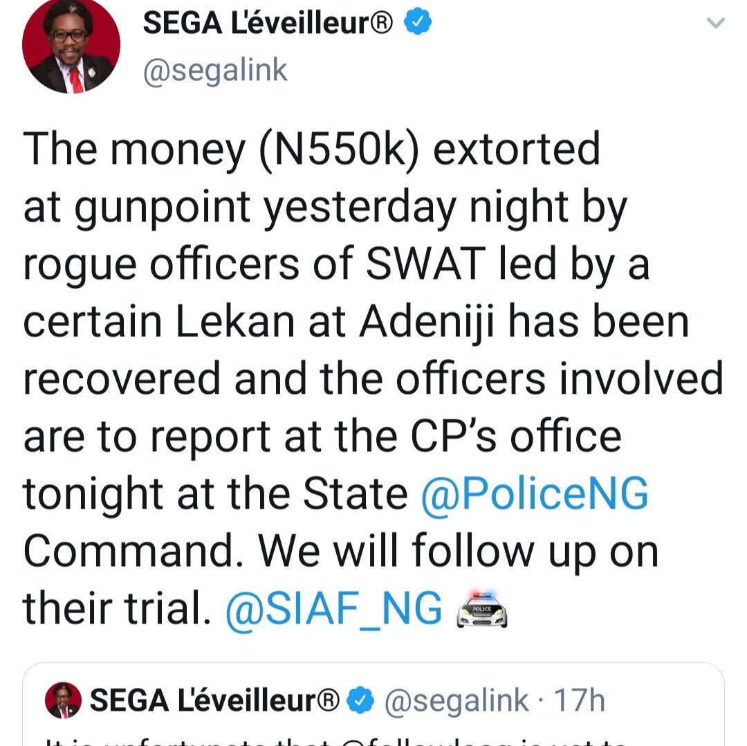 Segalink said a citizen was apprehended at gunpoint Wednesday night, Jan. 25, at the Lekki Ikoyi Link Bridge by members of a SWAT team led by an officer named Lekan. They allegedly extorted N550K from him. Segalink stated that he interfered and the money was recovered, adding that the police involved are likely to report to the State Police Command’s CP’s office.