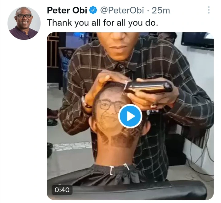 Former Anambra State Governor and presidential candidate of the Labour Party, Peter Obi, has expressed gratitude to the young man who carved a photo of him on his head to show his support for him ahead of the 2023 presidential election.
