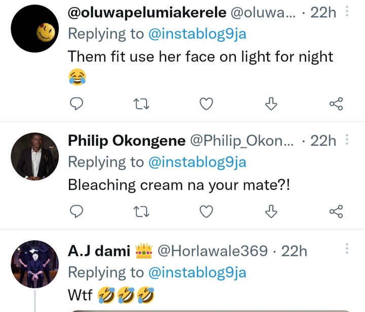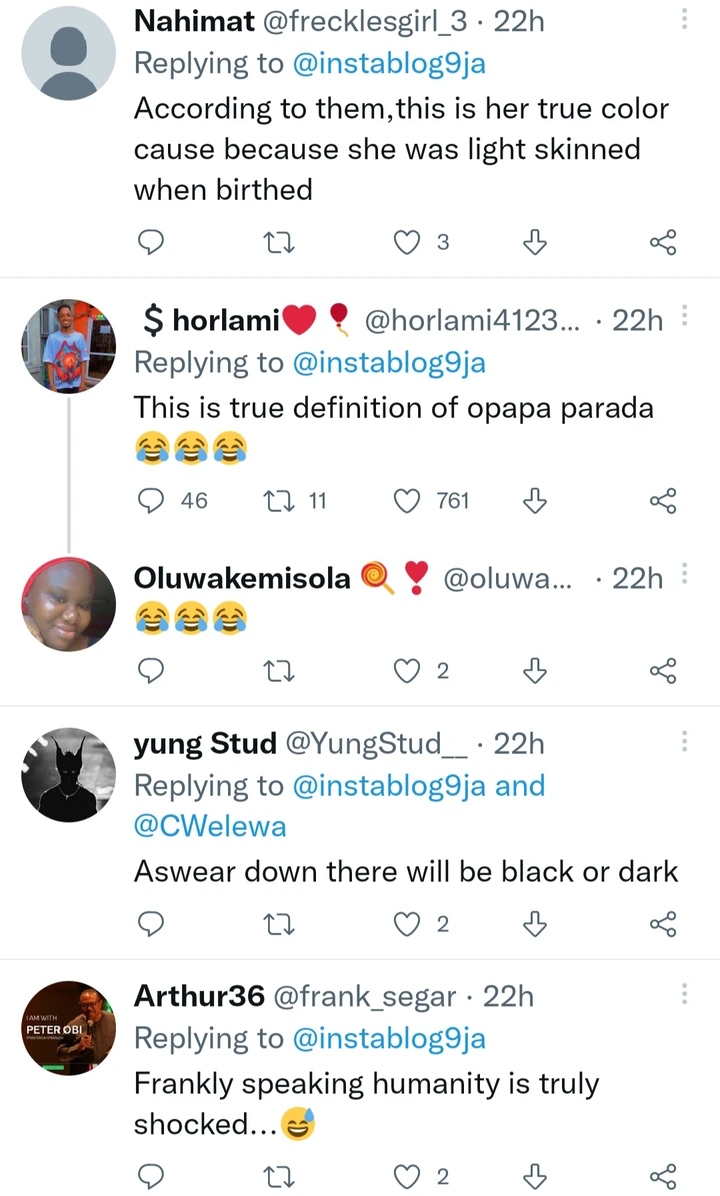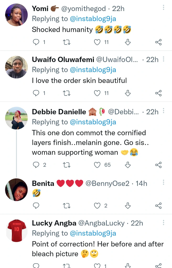 People commented under the post and had a lot of things to say. Someone commented and said “Her cream plug must be really proud of her. Not even a single black spot wow what a bleach.” Another person commented and said “I wonder what her legs will look like, her skin is completely damaged.” See the other comments people left under the post down below.