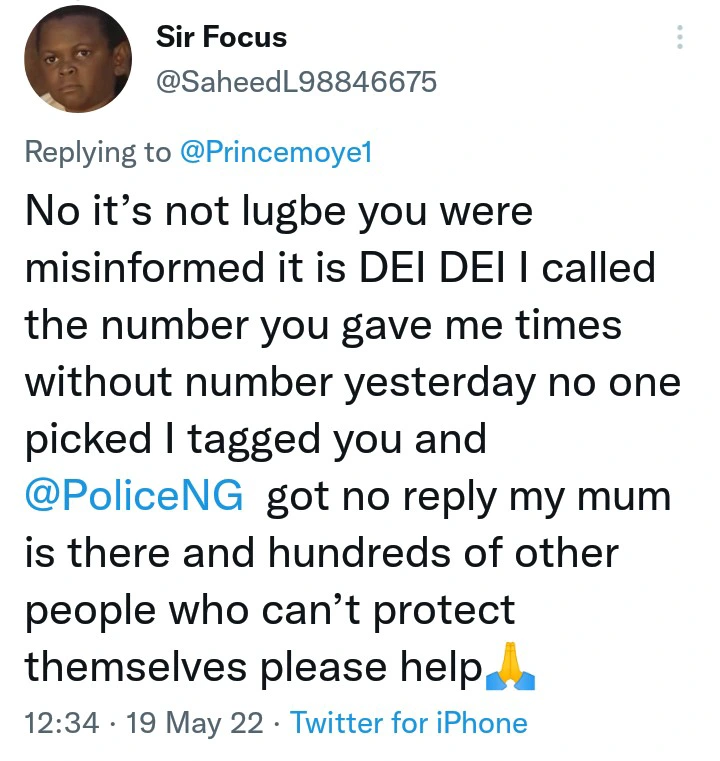 “No it’s not lugbe you were misinformed it is DEI DEI I called the number you gave me times without number yesterday no one picked I tagged you and @PoliceNG got no reply my mum is there and hundreds of other people who can’t protect themselves please help🙏,” @SaheedL98846675 said