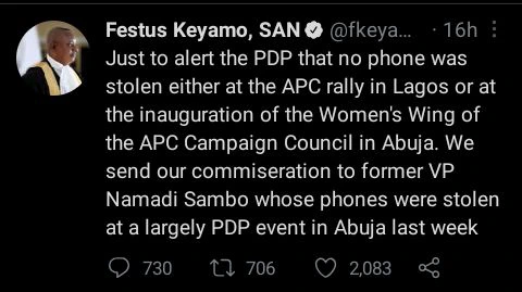 According to a tweet he made on his verified twitter handle, Festus Keyamo made it known that he just want to alert the Peoples Democratic Party, PDP, that no phone was stolen either at the APC rally in Lagos or at the inauguration of the women’s wing of the All Progressives Congress, APC campaign council in Abuja.