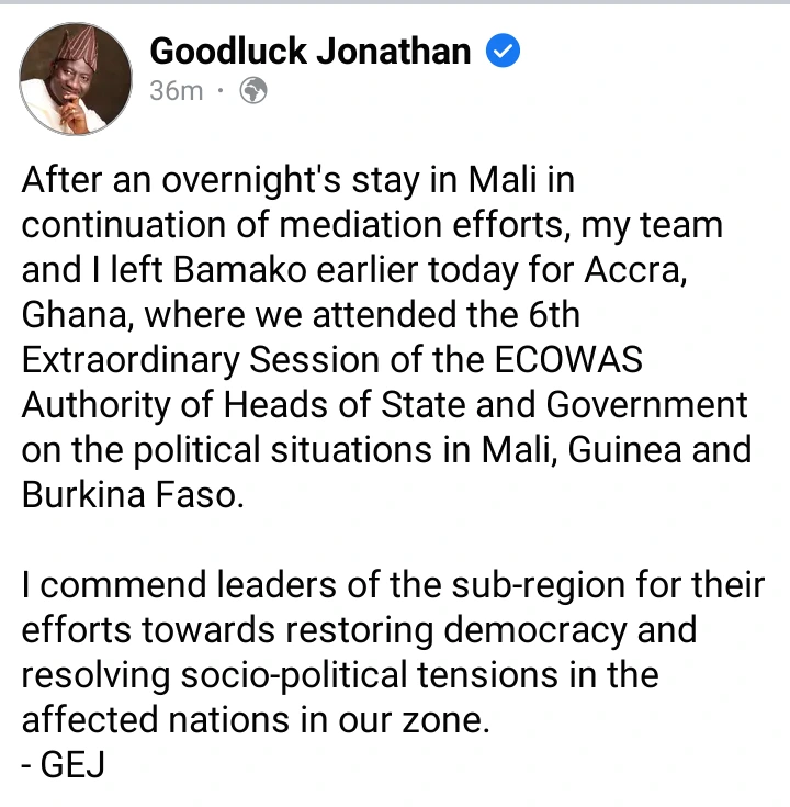 In his Facebook post, Goodluck Jonathan said that he commends the efforts of the leaders of the sub-region towards restoring democracy and resolving socio-political tensions in the affected nations in their zone.