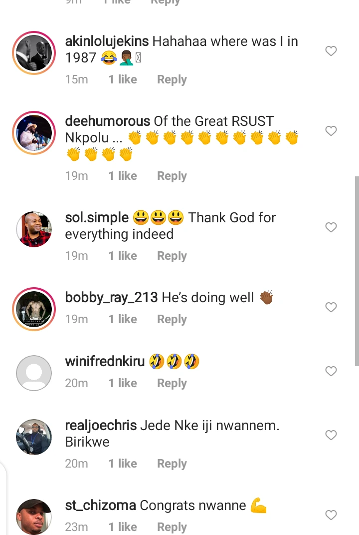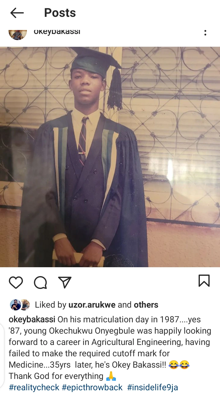 His caption reads, “On his matriculation day in 1987. Yes ’87, young Okechukwu Onyegbule was happily looking forward to a career in agricultural engineering, having failed to make the required cut-off mark for medicine. 35 years later, he’s Okay Bakassi!! Thank God for everything”.