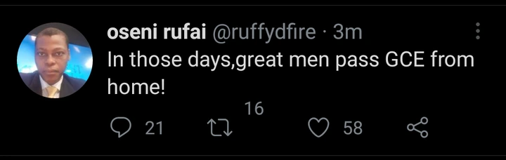 In a statement released by Oseni Rufai, an Arise Tv co-host, he quoted an old statement made by the Presidential Campaign spokesman of the All Progressive Congress (APC) Festus Keyamo, as he was speaking during an interview about the educational qualifications of their Presidential candidate, Asiwaju Bola Ahmed Tinubu. The statement reads, “In those days great men pass GCE from home”.