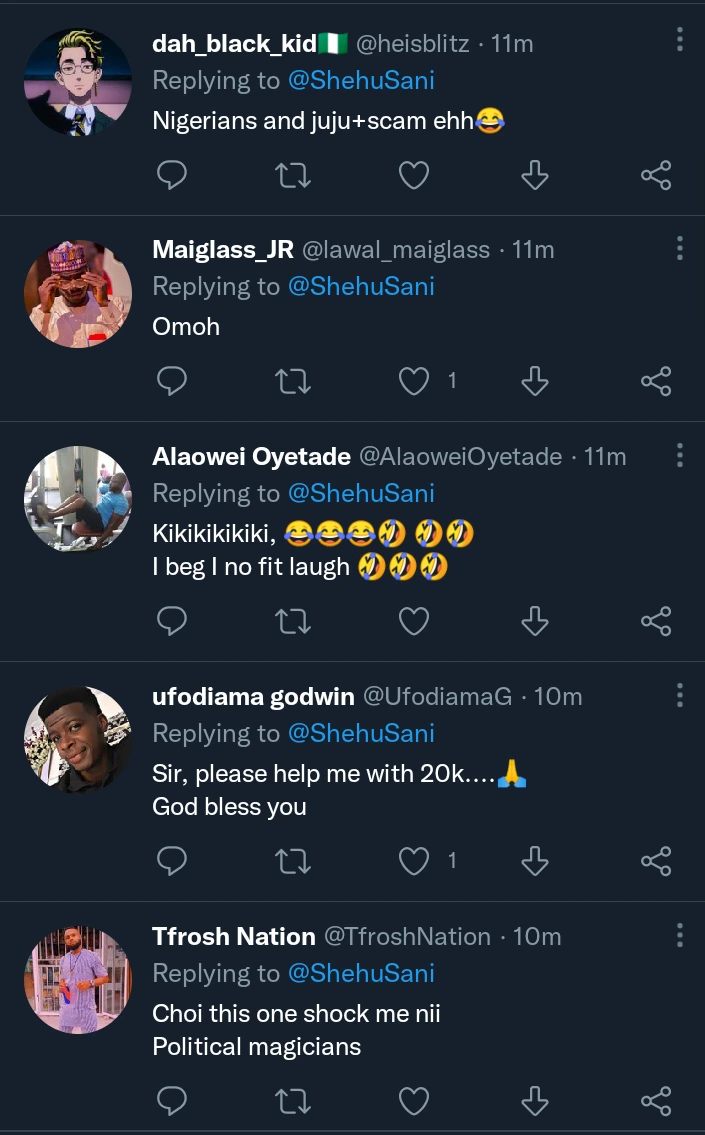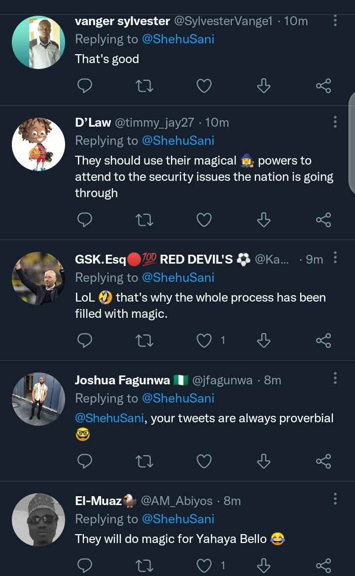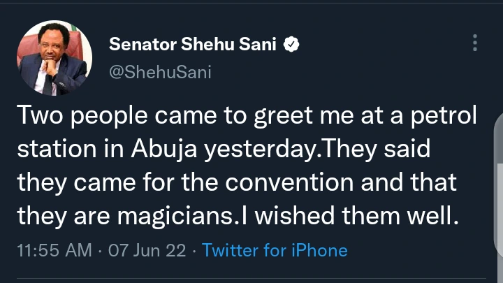 According to Senator Shehu Sani, he said the two people that greeted him earlier this morning claimed to be magicians and they have come to Abuja to be part of the APC convention that is happening at Eagle Square. Senator Shehu Sani said he only bid them success in whatever they have come to do.