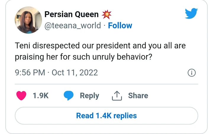From all indications, a majority of Nigerians are not happy with the way Teni reacted to President Buhari after receiving her national honour. Even if she is aggrieved disrespecting the president is not the best way to go about it. The office of the President is supposed to be respected as the number citizen.