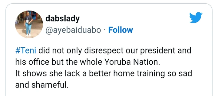 ayebaiduabo tweeted: she disrespected the entire Yoruba nation. It shows a lack of home training.