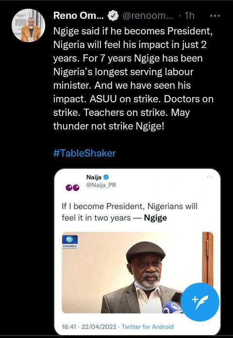 Reno Omokri while reacting to the statement of the Labour minister said “for 7 years Ngige has been Nigeria’s longest serving Labour minister. And we have seen his impact. ASUU on strike. Doctors on strike. Teachers on strike. May thunder not strike Ngige”