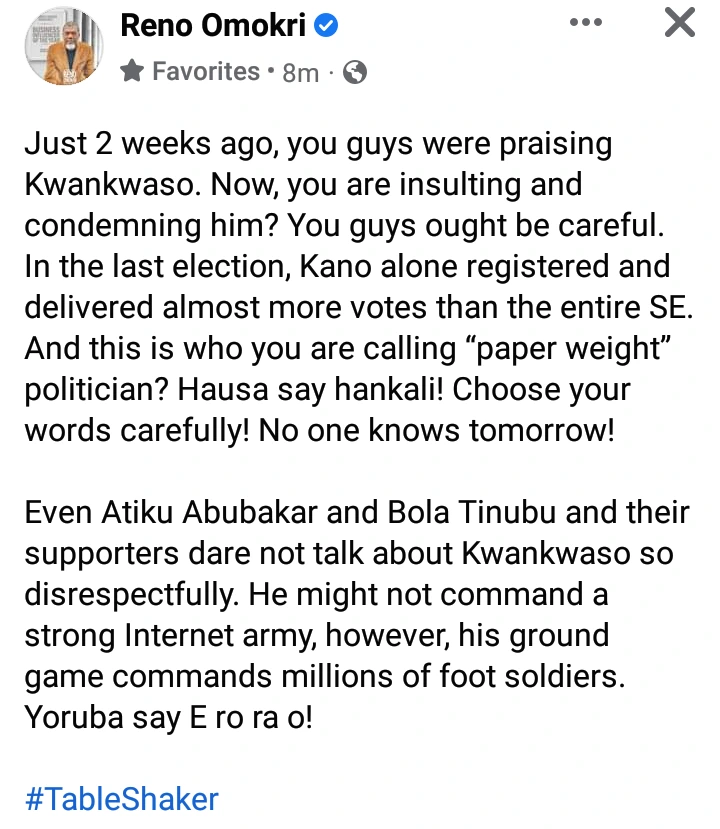 When Reno Omokri was reacting to this on his verified Facebook account, he urged the Peter Obi supporters to mind the way they talk to Kwankwaso because he is not the little person that they think he is. Even Tinubu and Atiku recognized her worth.