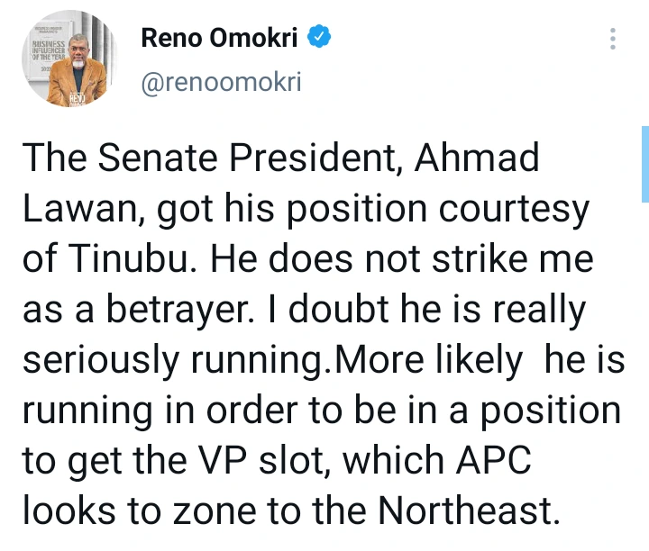 After the group picked the presidential nomination form for Ahmad Lawan, Reno Omokri took to his Twitter account to say that the Senate president got his position courtesy of Bola Tinubu and he doesn’t look like a betrayer. He said he doubts if Ahmad Lawan is seriously running, because he might just be in the race in order to get the vice president’s slot which APC might zone to the north east.