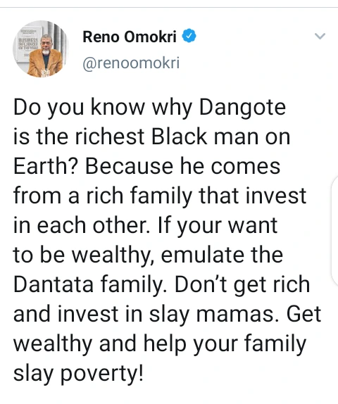 Reno Omokri further advised Nigerians to emulate the Dantata family if they want to be wealthy like Dangote, adding that they should not get rich and invest their earnings on women.
