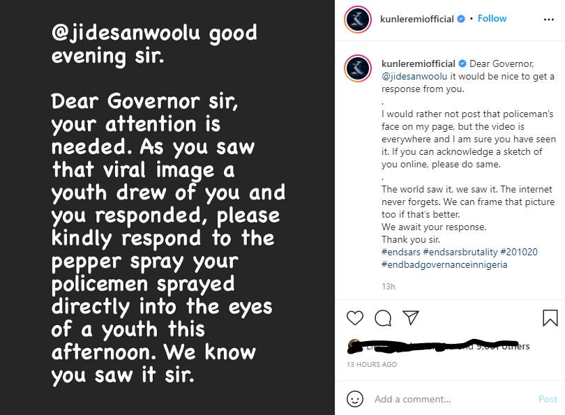 Nollywood actor, Kunle Remi has called on the Lagos State Governor, Babajide Sanwo-Olu to respond immediately to the disturbing video of the Uber driver who was pepper-sprayed by the police in an attempt to arrest him during the EndSARS memorial.