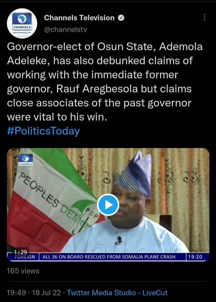 In an exclusive interview with Channels Television on Monday, 18th of July, 2022, Senator Ademola Adeleke was asked if the immediate past Governor of Osun State and Minister of Interior, Rauf Aregbseola helped him to emerge victorious at the Osun State gubernatorial election.