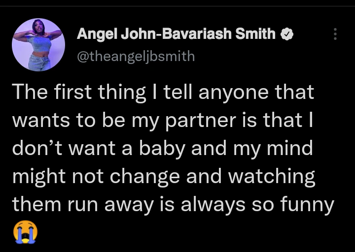 Reality TV star and ex Big Brother Naija season 6 housemate, Angel JB Smith, has revealed that one of her first terms and conditions to anyone who wants to be her partner is that she does not want to have a baby.