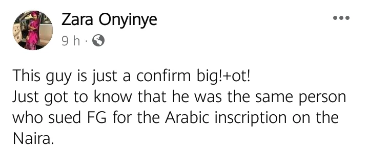 Meanwhile, following the many reactions to the pictures and words of the Nigerian lawyer, Zara Onyinye described the Nigerian lawyer as a ‘confirm bigot’ (a person who is against another on the basis of their membership of a particular group). In a series of posts on her official Facebook account, the APC media personnel and staunch supporter of the present government in Nigeria, revealed that the lawyer was the same person, who had sued the federal government some years ago because of the Arabic inscription on the Naira.